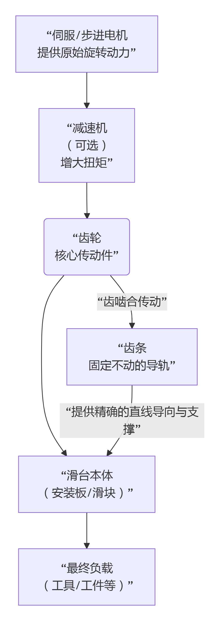 齿轮齿条滑台是一种将旋转运动精确转换为直线运动的机械系统。其核心原理可以概括为:一个旋转的齿轮 与一条固定的、带齿的条 相互啮合,当齿轮转动时,它会沿着齿条“行走”,从而驱动与齿轮连接的整个滑台部件产生直线位移。