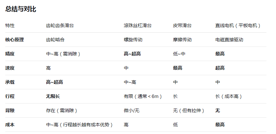 与之前讨论的皮带滑台、直接驱动滑台相比,齿轮齿条滑台有其独特的定位: