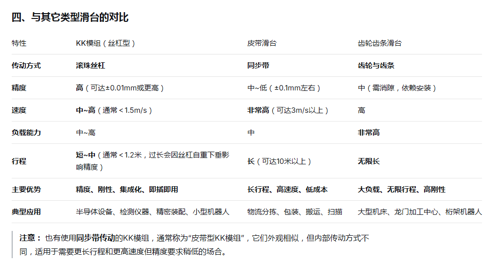 结论KK模组滑台是工业自动化技术走向标准化、模块化的杰出代表。 它将复杂的精密机械工程“封装”在一个易于使用的铝壳内,为工程师提供了一个可靠、高效、且成本优化的直线运动解决方案。在选择时,只需明确自身的负载、速度、精度和行程需求,即可快速选出合适的型号,极大地推动了自动化设备的快速开发与部署。