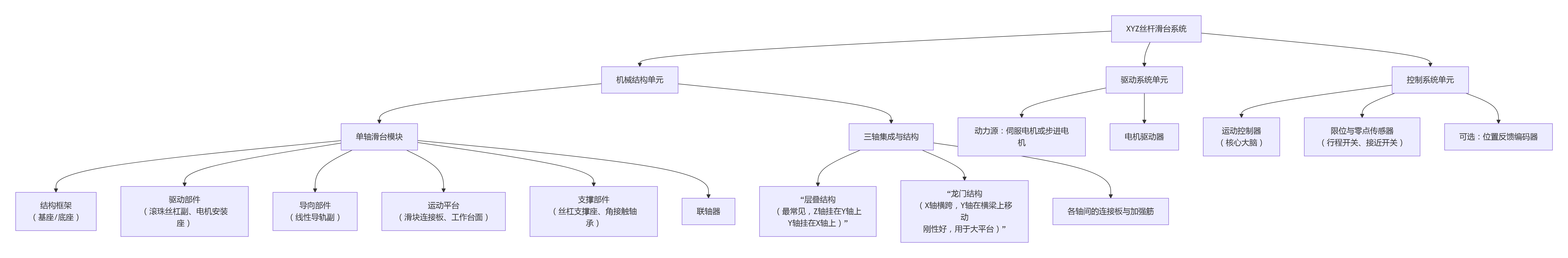 XYZ三轴丝杆滑台:机械结构、驱动与控制全解 XYZ丝杆滑台是一种非常经典且广泛应用的三维直角坐标运动平台。它的核心是“旋转电机 + 滚珠丝杠”的传动方式。其组成可以从机械结构、驱动系统和控制系统三个层面来理解,结构关系如下图所示: