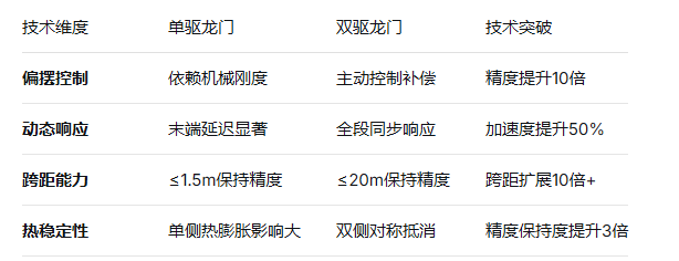 双驱龙门:同步驱动技术的精密运动典范一、核心定义双驱龙门系统是一种采用双侧电机同步驱动的精密运动平台,通过智能控制算法确保横梁在运动过程中保持零偏摆、零扭转变形,专为大跨度、高精度应用场景设计。 二、系统架构解析1. 机械结构组成[左驱电机] ←同步控制→ [右驱电机] ↓ ↓ [精密导轨] [精密导轨] ├─────────────────────┤ │ 高刚性横梁 │ │ (负载平台/加工头) │ └─────────────────────┘ 2. 三大核心子系统