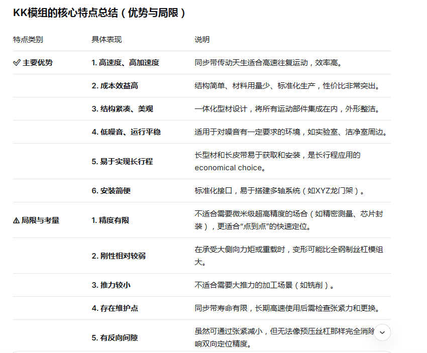 总结KK模组是同步带直线模组的经典代表,它凭借其一体化铝型材设计,在高速、轻载、中短精度、且成本敏感的应用领域中占据了不可替代的地位。 它不是万能的,但在其适用的赛道里,它是平衡性能与价格的最优解之一。 |