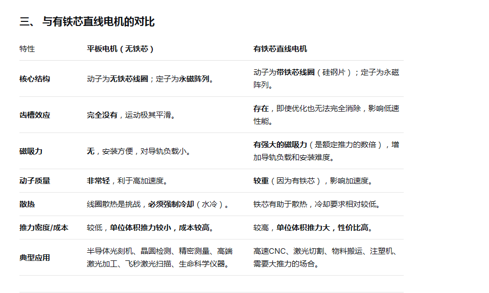 无铁芯直线电机 | 定义纳米级精度与超高动态性能的标杆 平板电机(也称为直线电机或无铁芯直线电机/U型槽直线电机)的动子和定子是它的核心部件,其设计与传统旋转电机或带铁芯直线电机有显著不同,这直接决定了它的卓越性能。 下面我将为您详细解析平板电机动子和定子的细节与特点。 一、 核心结构细节平板电机是一种将旋转电机“展开”的直驱机构。其基本结构如下: