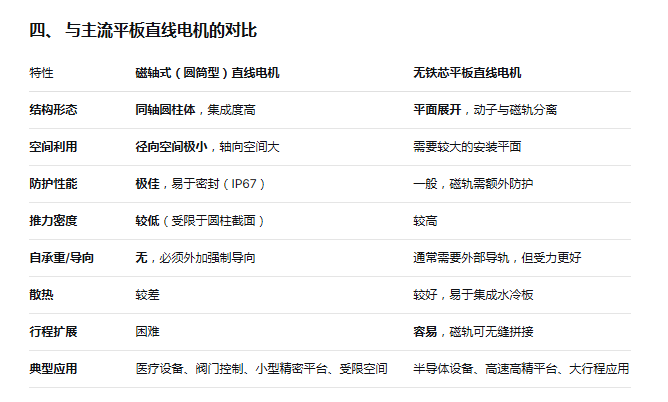 总结磁轴式直线电机是直线电机家族中一个“精巧的利基产品”。它以牺牲推力密度和行程扩展能力为代价,换来了无与伦比的紧凑性、易密封性和平滑运动。它并非追求极限性能的选择,而是在空间和防护要求极为苛刻的特定应用中的最优甚至唯一解。选型时,必须将其推力-速度曲线与热限制以及整个导向系统的综合成本一并考虑。 |