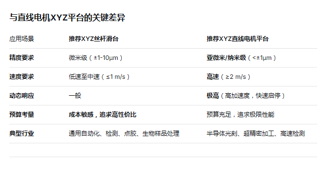 其局限性在于速度和动态响应:由于丝杆的机械惯性,它不适合需要极高扫描速度、极高加速度或纳米级定位的场景,这类需求应转向直线电机平台。