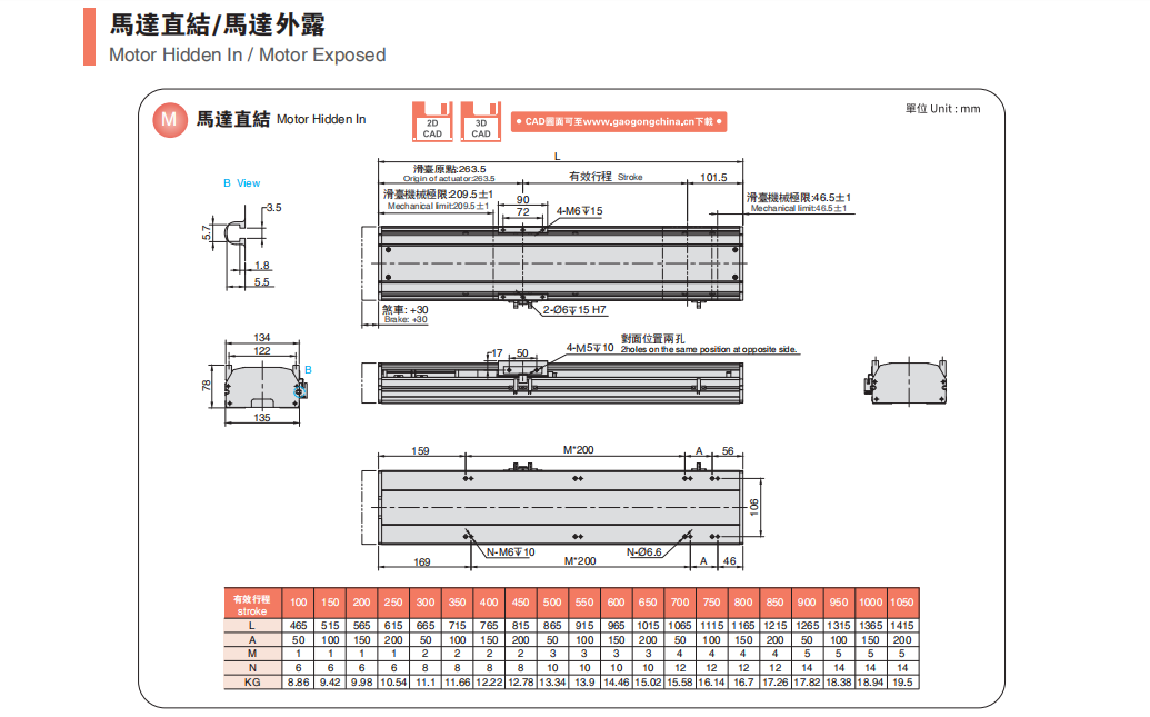 二、同步带型 主要组成由: 皮带、直线导轨、铝合金型材、联轴器、马达、光电开关等。皮带安装在两侧的传动轴,其中作为动力输入轴,在皮带上固定一块用于增加设备工件的滑块。当有输入时,通过带动皮带而使滑块运动。